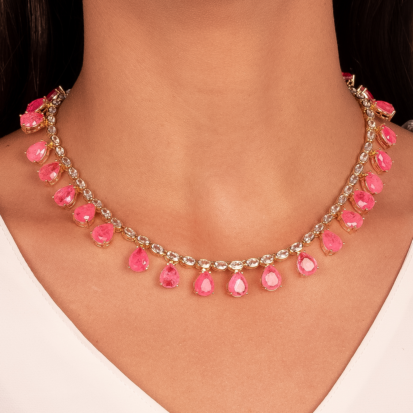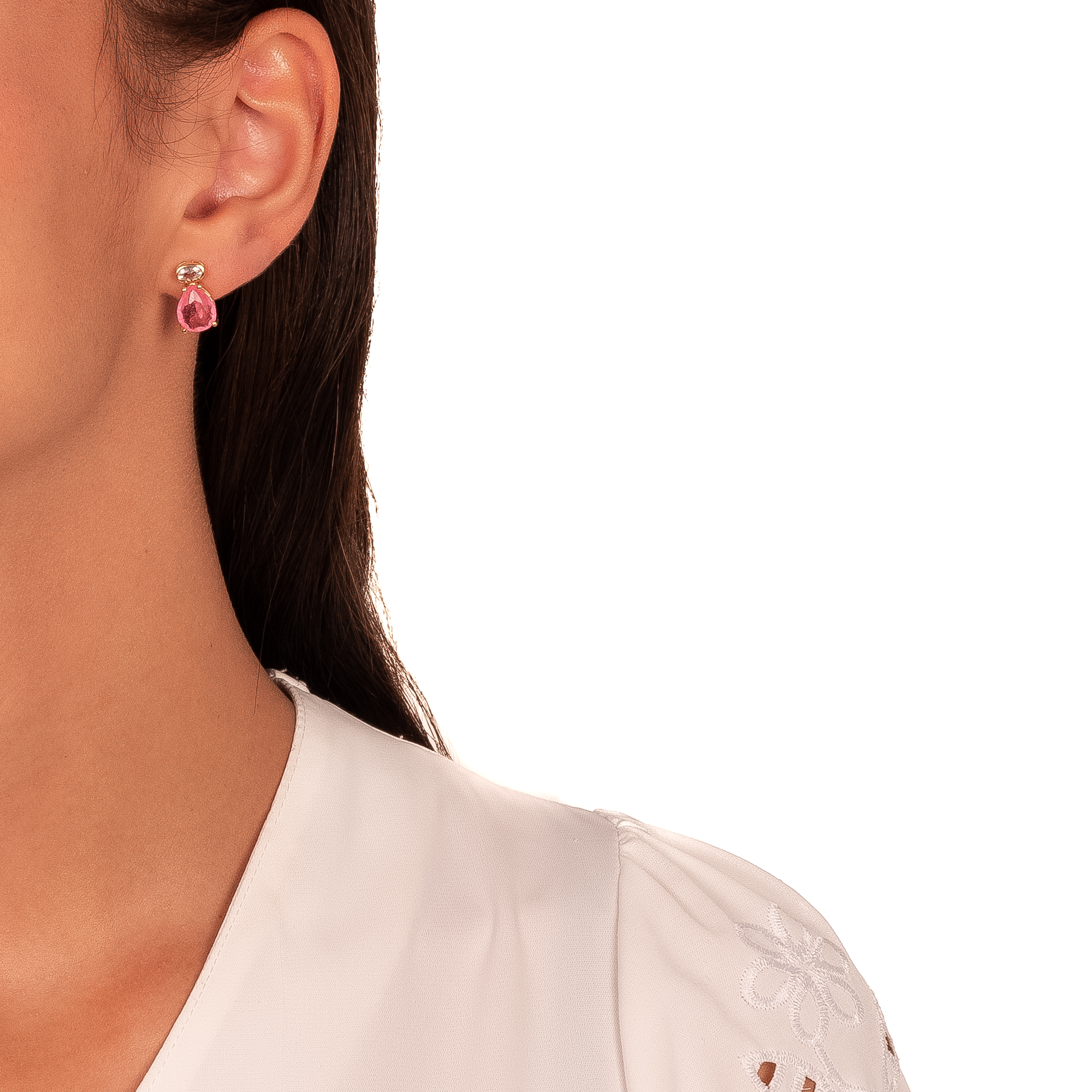 Semijoia – Conjunto Gota Cravejado Rosado Dourado Banho em Ouro 18k. (Cód. 98518)